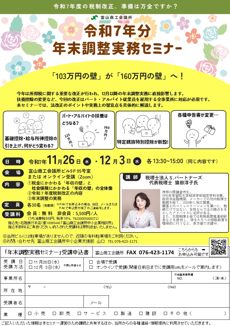富山商工会議所会員事業所の方は無料、非会員事業所の方は5,500円/人(消費税込)